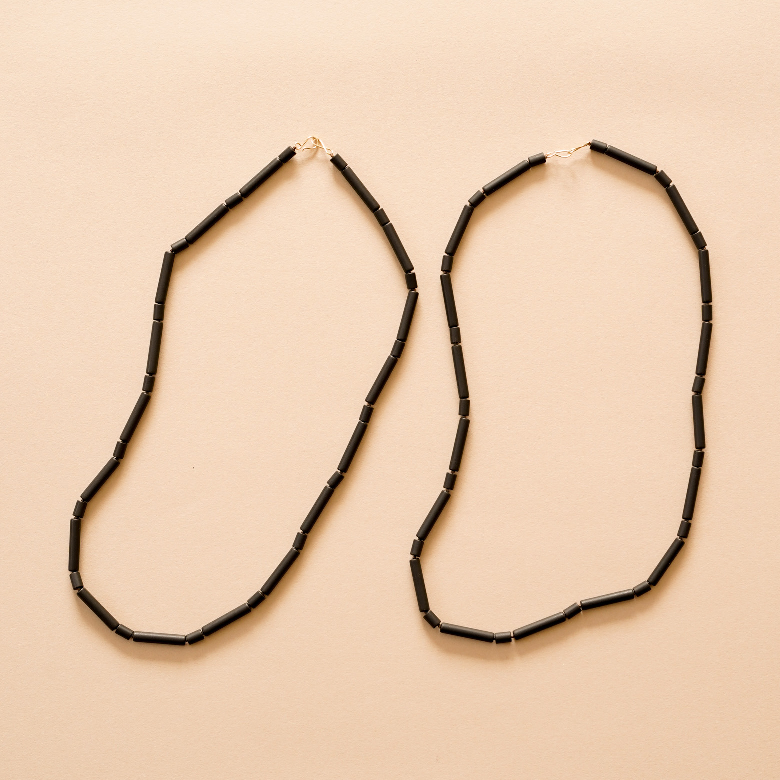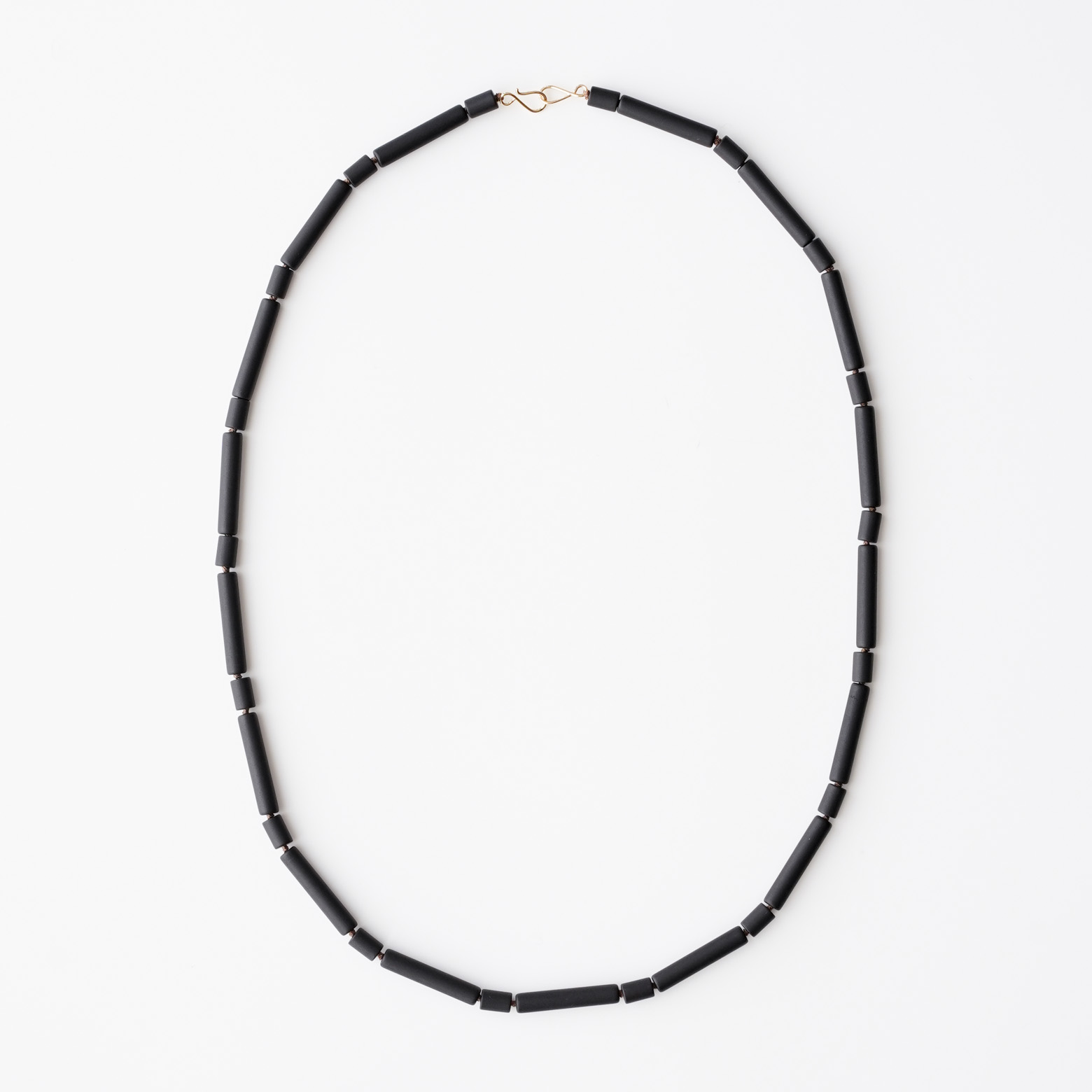 マットに磨かれたオニキスのビーズネックレス。光を強く反射することはありませんが、手に取ると、石ならではの重さと、静かな存在感が伝わってきます。ビーズとビーズの間には、ひとつずつ結び目をつくり、わずかな余白を残しています。均一ではない長さのビーズが、結びによってつながることで、自然なリズムが生まれます。留め具には、オリジナルでデザインした10金のパーツを使用しています。石の連なりの中で、穏やかな金色が、全体の印象を引き締めています。