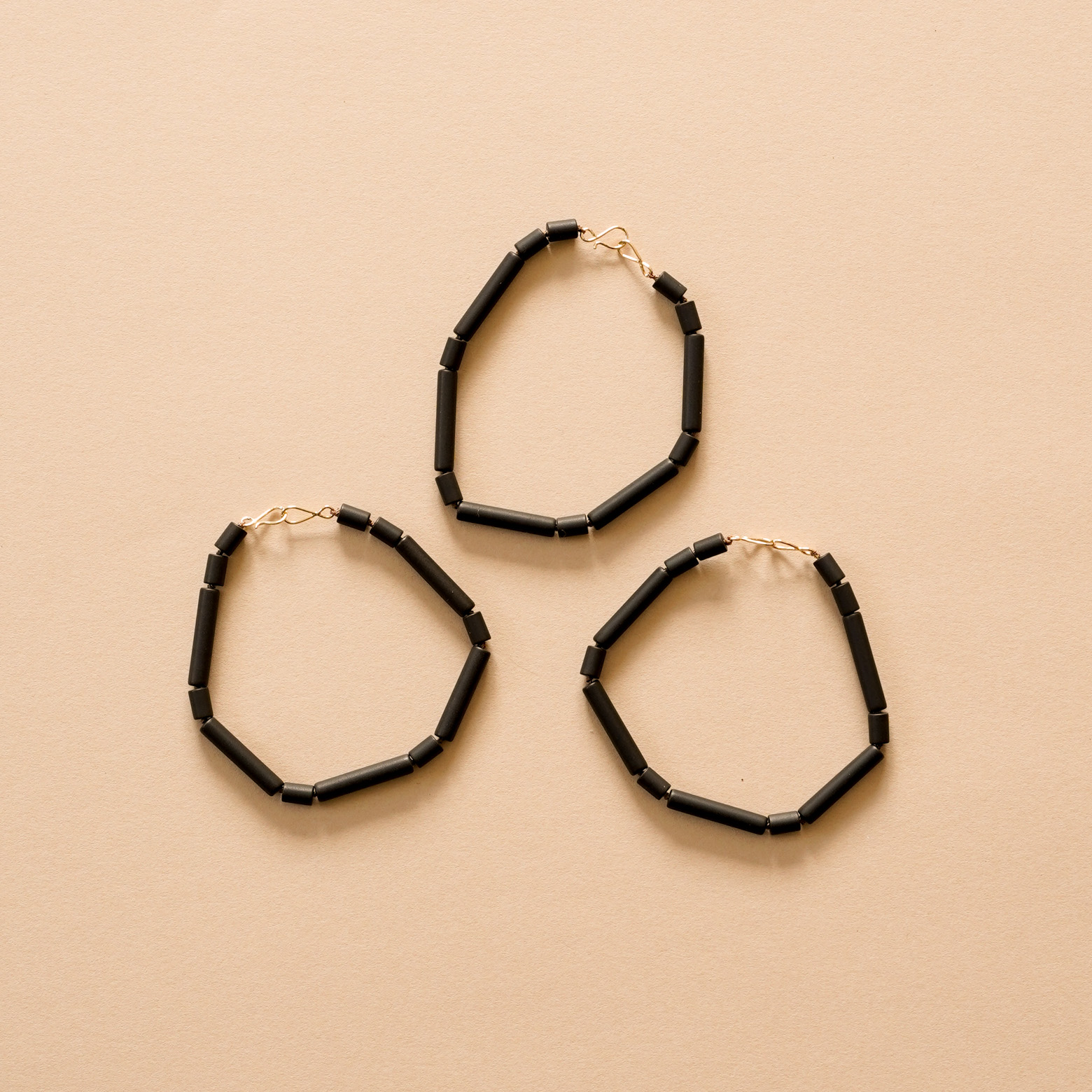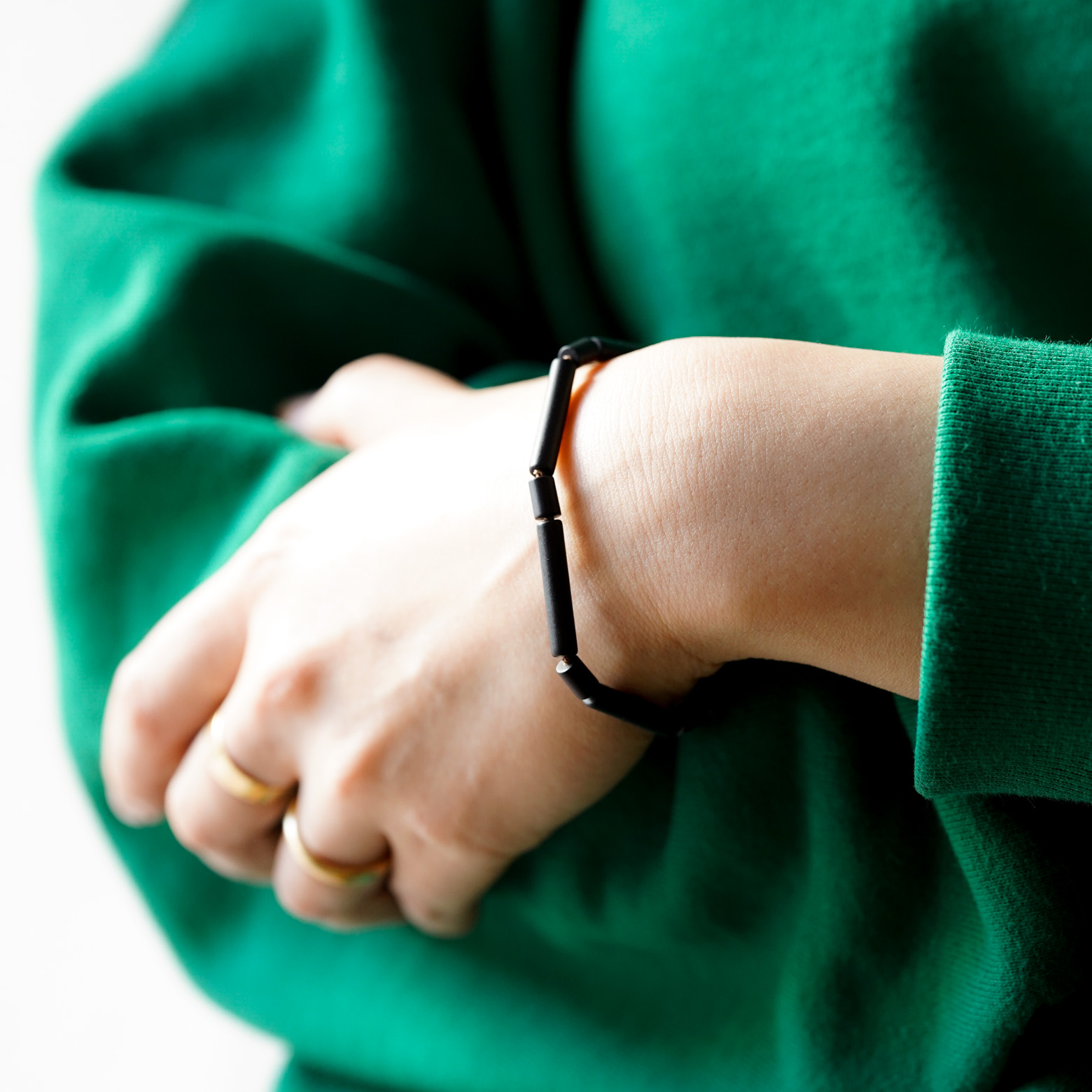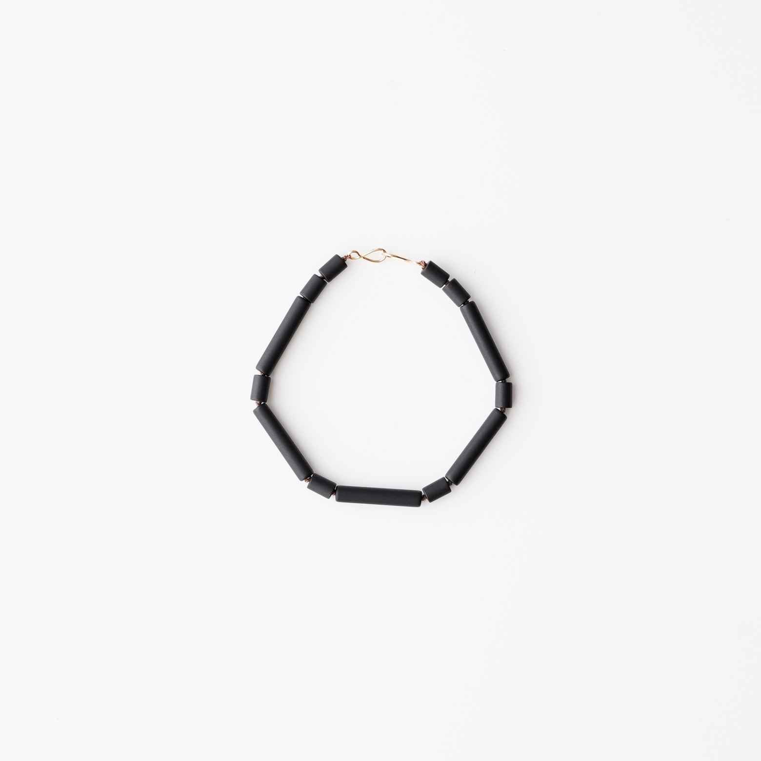 マットに磨かれたオニキスのビーズブレスレット。光を強く反射することはありませんが、手に取ると、石ならではの重さと、静かな存在感が伝わってきます。ビーズとビーズの間には、ひとつずつ結び目をつくり、わずかな余白を残しています。均一ではない長さのビーズが、結びによってつながることで、自然なリズムが生まれます。留め具には、オリジナルでデザインした10金のパーツを使用しています。石の連なりの中で、穏やかな金色が、全体の印象を引き締めています。